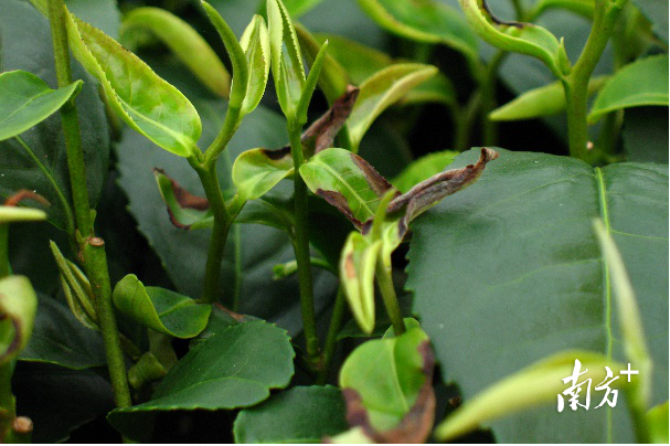 茶小绿叶蝉(Empoasca onukii)属半翅目叶蝉科,具刺吸式口器。在广东一年发生10余代,有两个发生高峰,夏、秋茶受害严重。卵产于茶树嫩梢中,以成虫越冬。以若虫和成虫刺吸刺吸茶树嫩茎、嫩叶汁液为害。受害芽叶沿叶缘变黄,叶脉变红,卷曲粗老;为害严重时,芽叶叶缘红褐焦枯,芽叶生长停滞,甚至全叶焦枯脱落。